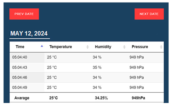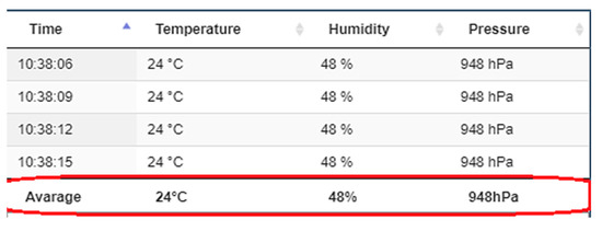 The sensor makes measurements for the three quantities four times a day. Their average value is visualized in the last row of the table (Figure 7).