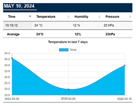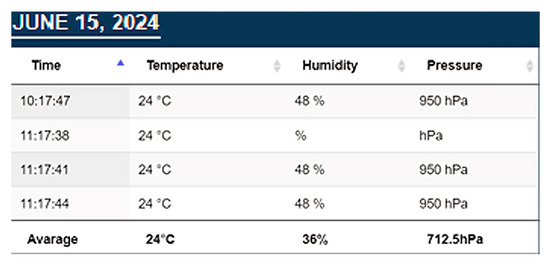 Data is the main information provided by the application. For each room, three types of data are reported, which are visualized in tabular and graphical forms. Temperature is measured in Celsius (°C), humidity in percent (%), and pressure in hectopascals (hPa).