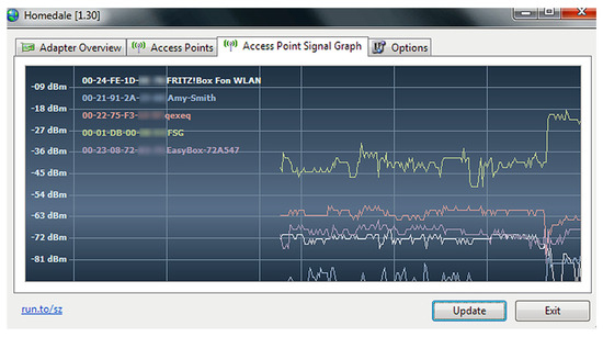 The acrylic network analyzer (Figure 1) can monitor WiFi network packets and display wireless networks and their users like a standard scanner. It uses a graphical interface to display networks and clients and to show packet details [17]. The captured traffic details are viewed in real time using a unique packet dissector (the so-called WiFi network packet parser). There is also the option to use a predefined pcap file for network packet analysis. The software includes an integrated filter editor, with the help of which the WiFi network packet type can be selected for displaying. It also helps to indicate WiFi attributes and perform filtration via SSID or MAC address, etc. Another part of the software—the WiFi inventory module—can help to replace MAC addresses with common names.