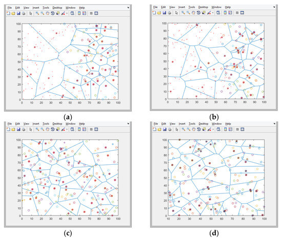 Figure 6 presents the individual clusters formed when using the four routing protocols. In the figures, the sign “o” indicates the active nodes in the network; the sign “*” indicates the heads of each cluster; and the sign “.” indicates the inactive clusters.