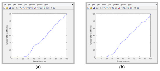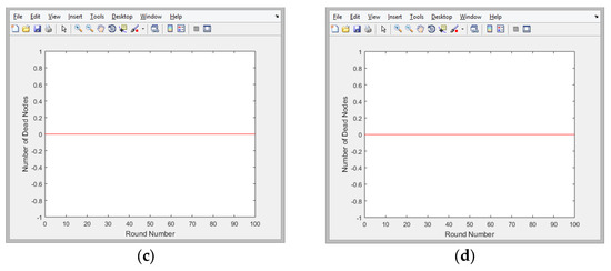 Number of inactive nodes in 100 iterations of traversing the nodes in the network: (a) EAMMH; (b) LEACH; (c) SEP; and (d) TEEN.