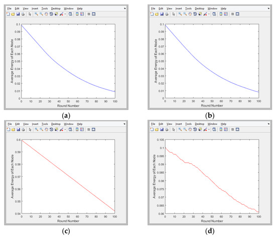 Average energy of each node in the network over 100 iterations of traversing the nodes in the network: (a) EAMMH; (b) LEACH; (c) SEP; and (d) TEEN.