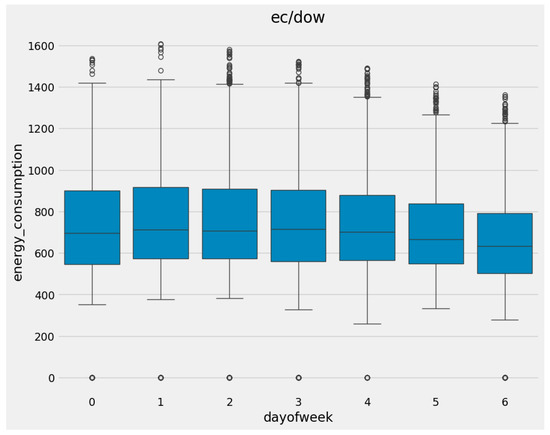 Furthermore, Figure 4 represents the effect that the days of the week have on electricity consumption. As can be observed, during the weekend days (Saturdays (5) and Sundays (6)), consumption is reduced. Moreover, it is derived that in the particular dataset, this variable has less impact on electricity consumption compared to the hour of the day.