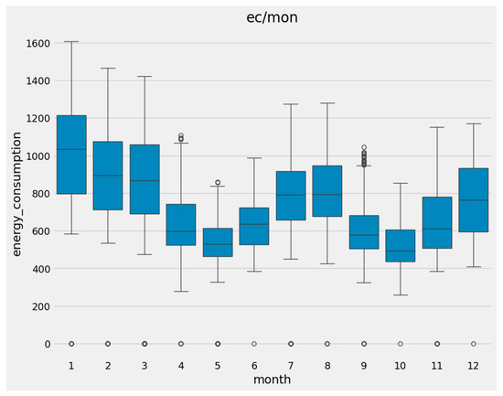 In addition, from Figure 5 it can be concluded that the winter season had a larger impact on the overall electricity consumption. This would suggest that people in the area would rather utilize electricity than other methods of heating to warm up in the colder months. Additionally, a slight increase in consumption in the summer months June and July can also be observed, which can be translated to electricity usage for cooling purposes.