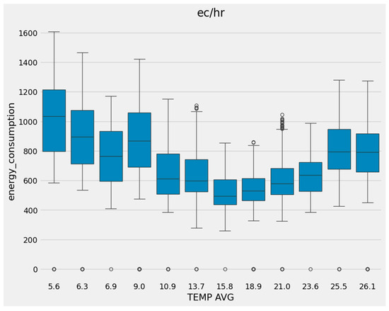 Figure 3 indicates the impact of the hours of the day compared to the electrical consumption. It can be observed that the peak use of electricity during the day is, in general, in the late evening hours between 18:00 and 21:00, and, in particular, the highest average consumption of the day is at 20:00, as it appears from the median. On the other hand, it can be observed that during the midnight hours, consumption drops significantly, with the lowest being at 04:00. These results seem obvious, but they prove that the process produces reasonable outcomes.