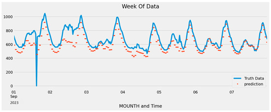 As can easily be observed, the prediction is highly correlated with actual consumption. In addition, one of the advantages of this pattern is that it is modular, so it allows the data to be examined in greater detail. This gives the ability for research to be carried out at shorter intervals, even days or hours. In this case, Figure 9 shows the analysis for the first seven days of September 2023.