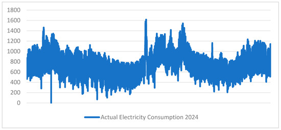 The average value of the predictions is 704. On the other hand, the actual average value of the year 2024, based on the real recorded electrical consumption data, is 697. The real, existing values for consumption in 2024 are presented separately in the graph in Figure 11.