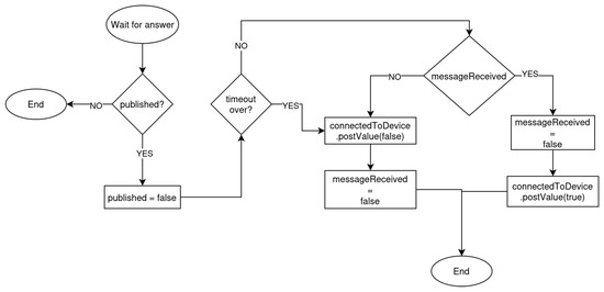 Connected state management is implemented using the connectedToDevice variable, which is a MutableLiveData within the ViewModel and is exposed to the UI layer as LiveData. Each time the application publishes a message to the autoclave device, the mechanism illustrated in Figure 5 is triggered. Based on whether a response is received within the specified timeout, the variable is updated accordingly, allowing the user interface to reflect the current connectivity status in real time.