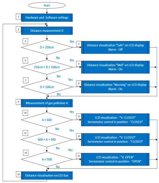 The operating algorithm used an ultrasonic sensor to measure the distance to obstacles and a gas sensor to measure the pollution level in the vehicle cabin. Depending on the measured values, the algorithm controls the LCD display, beeps and automatically adjusts the cabin ventilation. The presented operating algorithm in Figure 1 ensures increased safety and comfort for the driver and vehicle occupants.