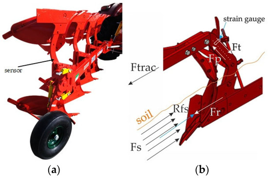 Mounting the strain gauge on the plough shank (a); forces acting on the plough (b).