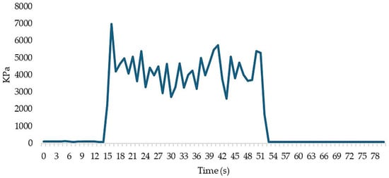 The experimental results were differentiated over time, with measurements taken at one-second intervals while moving at the speed of 5 km/h. Assuming the speed remains constant, a continuous fertility graph for the tested area (Figure 6) can be created. Fertility levels vary based on the soil densities, impacts from stones, and the presence of cavities. Areas with zero values occur before the movement commences and after its cessation.