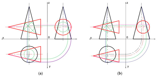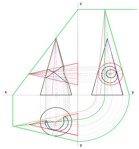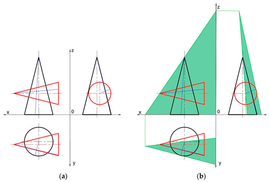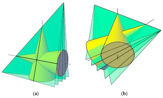 - Tsoneva, Z. Intersection of inclined conical planes. Application of traditional methods. J. Ind. Des. Eng. Graph. 2015, 10, 73–78. [Google Scholar]