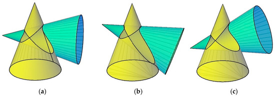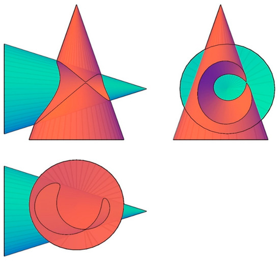 Depicted in Figure 7 are simulations of cones intersecting at crossed axes to illustrate the generation of the desired curve, visualizing the concept defined in the preceding statement. The method for identifying the position of the node along the smooth continuous curve in the form of a spatially asymmetric lemniscate during the initial stages of a similar problem-solving process, discussed above, proves to be efficient even if the angle between the two crossed axes of the conical surfaces is different from 90 degrees.