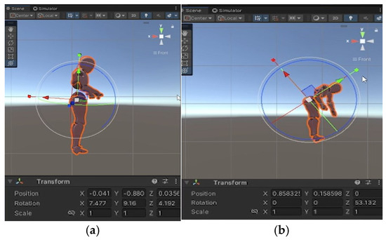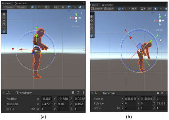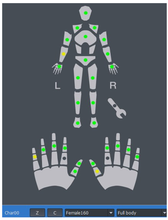 At the beginning of each session, the system was calibrated to account for the participant’s unique anatomical characteristics, ensuring the accuracy of motion capture. The example shown on Figure 2 presents a visualization during the session of a 160 cm-tall female.