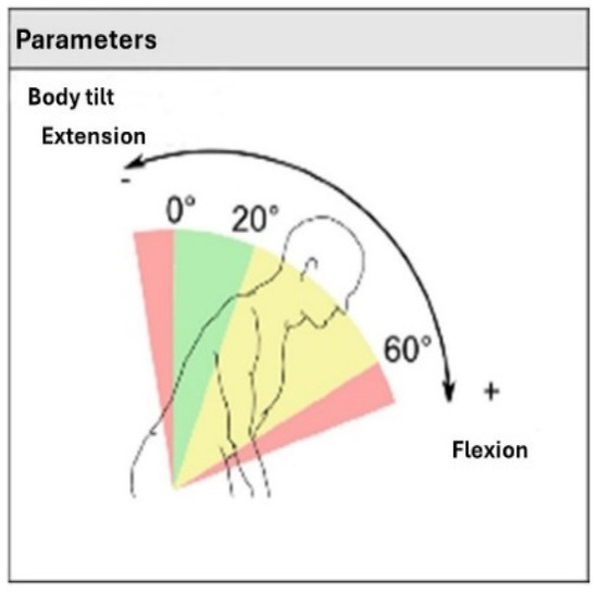 Figure 3 illustrates the ISO 11226:2000 reference framework for assessing static working postures. Angle measurements are based on the neutral zero method, wherein all joint movements are measured relative to a predefined zero position [15]. This neutral posture corresponds to a healthy individual standing upright, with arms relaxed at the sides, thumbs pointing forward, feet positioned parallel, and gaze directed straight ahead. From this position, movement in either direction within a given anatomical plane is recorded as positive or negative.