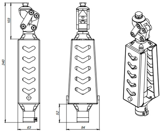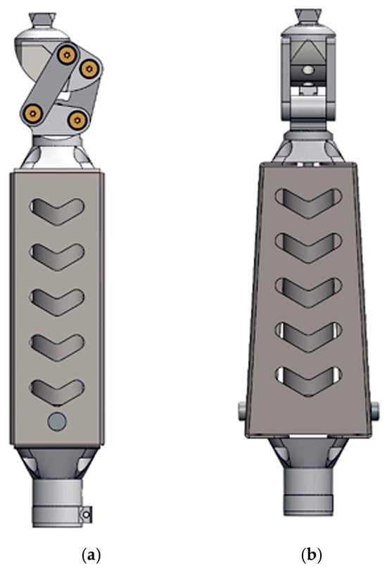 The views in Figure 5 depict the external appearance of the prosthesis in its fully assembled state. The side projection shows the upper joint block and its rotary components, while the front projection highlights the weight-relief cutouts on the central body and the lower mounting mechanism.