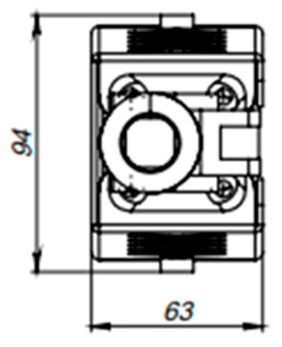 Figure 3 shows the interface from above, with a width of 63 mm and a length of 94 mm. The central cylindrical mounting hole allows seamless integration with modular prosthetic systems.