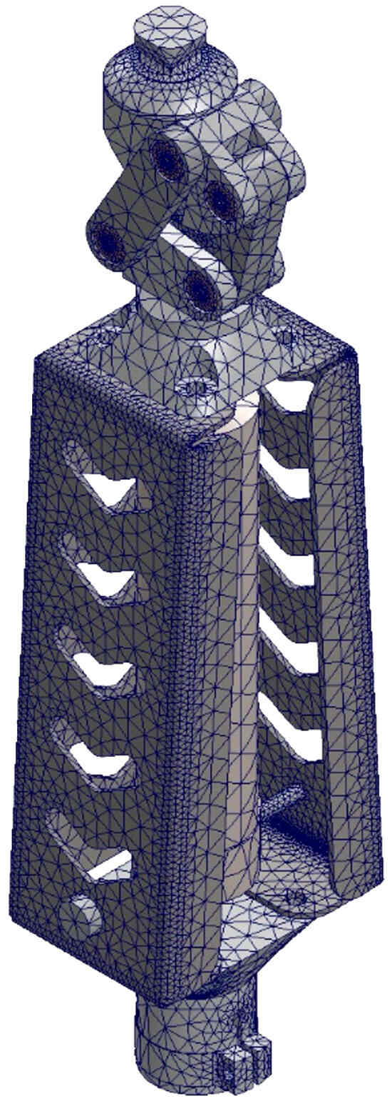 - Fixtures—The bottom mounting surface of the prosthesis was fully constrained in all degrees of freedom, simulating a rigid fixation to a support surface.