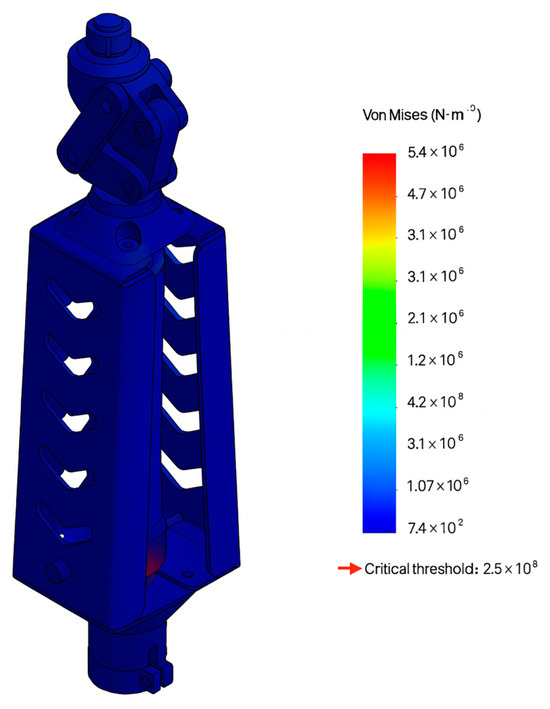 The stress distribution analysis shows a peak stress value of 535 MPa, located in a localized region near the upper hinge block. Areas of high stress are highlighted in red, while regions of minimal loading appear in blue (Figure 12, Figure 13 and Figure 14). The critical zones have been annotated in the diagram to enhance interpretability and emphasize regions that may require structural reinforcement or material reassessment. Despite localized stress exceeding the material yield strength, the primary load-bearing structure remains within acceptable safety limits.