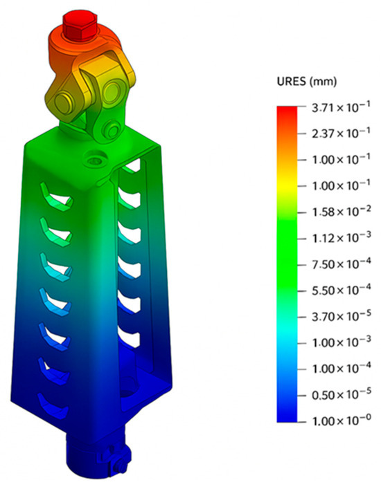 The total displacement plot reveals that the maximum displacement is 0.375 mm, while the minimum is approximately 0 mm. Most of the displacement is concentrated around the upper joint block. These values remain within acceptable limits, indicating high structural stiffness.