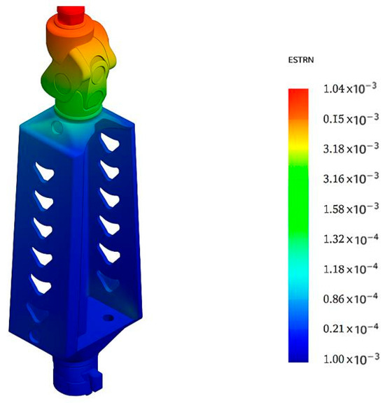 The maximum equivalent strain is 1.06 × 10−3, while the minimum is 1.80 × 10−12. Strain is predominantly localized in the upper joint area where stress concentration is observed.