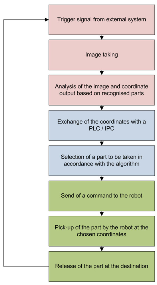 7]. Regardless of the process involved, advanced processing algorithms compare the reference image with the one taken. For flexible feeding, ready tools are used to obtain the coordinates of recognized parts. Usually, with 2D systems, this involves X, Y and an angle of rotation of the part. This is the most frequent case; by contrast, 3D bin picking systems add an additional layer of complexity. Once established, the next step is to transfer the coordinates to a higher control system for further processing. With the processing of this system, the vision system becomes idle until the next image recognition is requested. The control system, by means of an optimization algorithm, decides which is the most appropriate part to be taken (different parameters can be involved, such as distance from the robot, position near edges, or isolation of the part from other parts) [