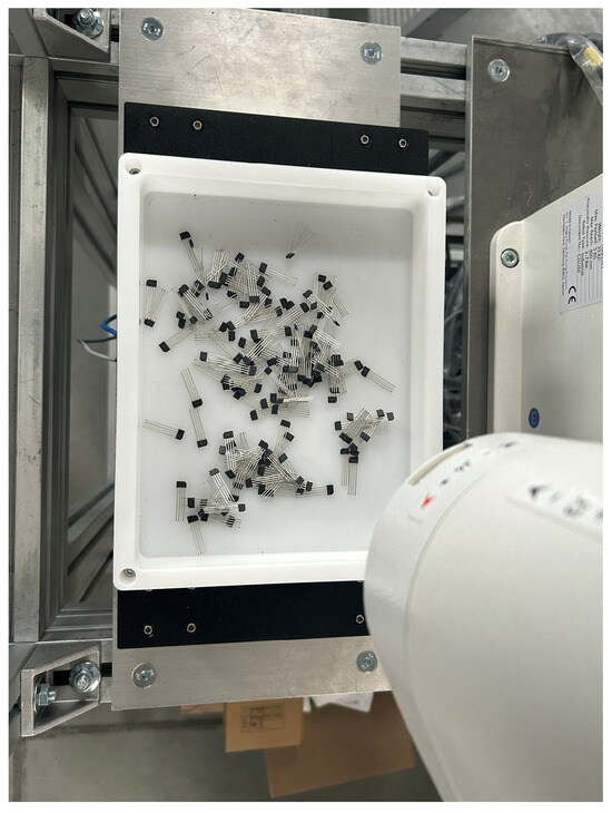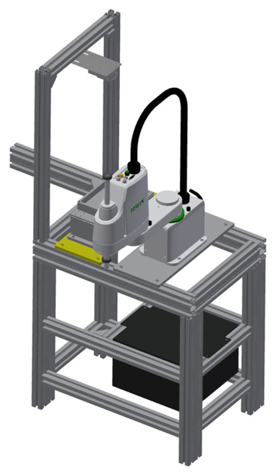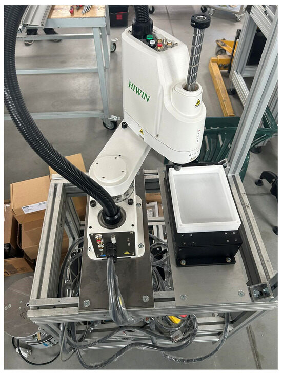 Figure 4 shows the real developed system based on the 3D model. It features a Hiwin RS405-400-200-LU SCARA robot (Taichung, Taiwan), an OC53 camera from IPF Electronic GmbH (Altena, Germany), and a three-axis vibrating device to randomize (separate) the parts based on a predefined vibration algorithm. All devices are connected through the Ethernet-based interface PROFINET. The design deliberately avoids using a PLC since the robot program could handle the coordinate acceptance and communication with the camera and vibration system.