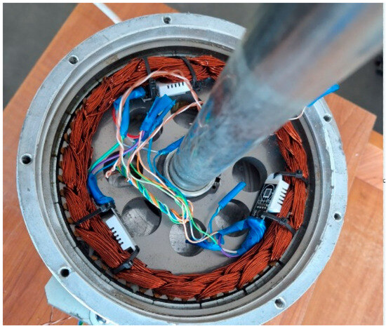 This study investigates the thermal state of a 1000 W vertical-axis wind turbine. The wind turbine generator is equipped with three DHT11 temperature and humidity sensors mounted on its windings (Figure 1). The main objective of the research is to develop a mathematical model for a diagnostic system that accounts for the influence of varying external conditions—such as ambient temperature, wind speed, and air humidity—as well as mechanical losses and different cooling methods, including ventilation, heat sinks, and convection.