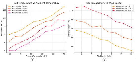 Temperature behavior of the generator windings under different environmental conditions: (a) Dependence of coil temperature on ambient temperature for various wind speeds; (b) dependence of coil temperature on wind speed for different ambient temperatures.
