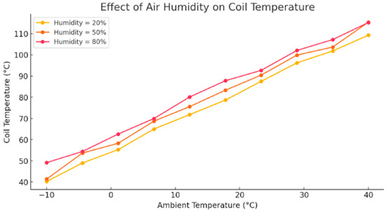 The introduction of additional ventilation openings (greater than 0.1 m2) and heat sinks has proven effective, reducing winding temperatures by approximately 30–50% under critical conditions. Air humidity also plays a substantial role: at high humidity levels (above 70%), the temperature of the windings increases by 5–10%, which is attributed to the reduced efficiency of heat dissipation due to changes in the air’s thermophysical properties.