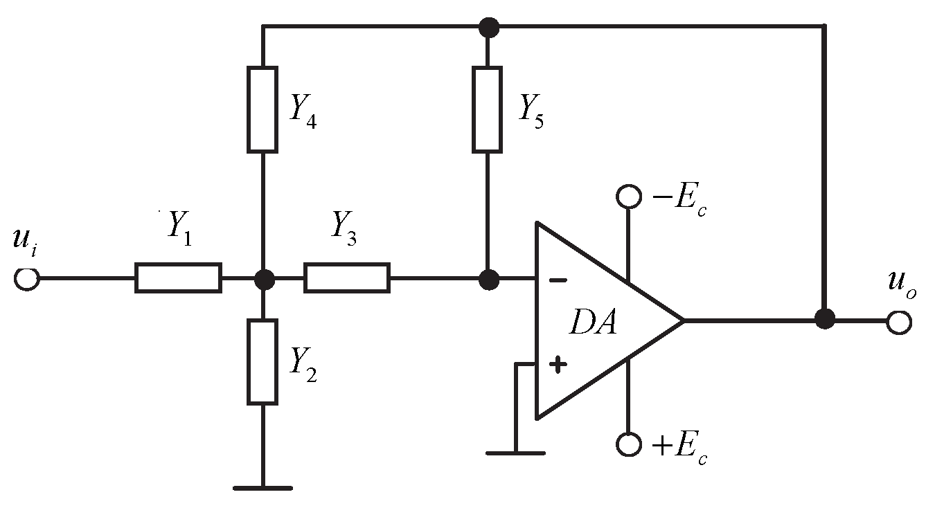 10], the expression for the transfer function of an active filter with a single operational amplifier using the multi-loop negative feedback method, in idle mode, can be derived and expressed by Equation (2).