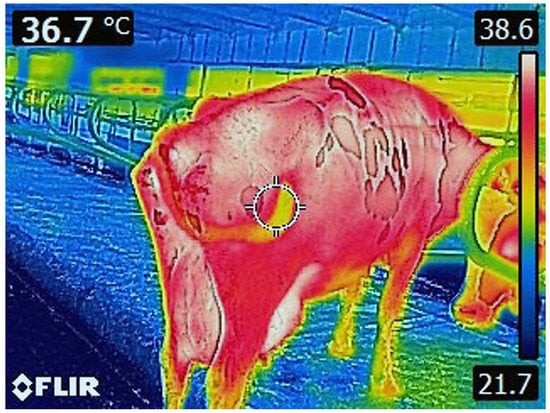 The issues of feeding humanity from a modern perspective are of strategic importance. The sustainable increase in the population poses a number of challenges to the food industry. The production of milk and dairy products plays a decisive role in the food security of the population globally. Realities and developments create a need for a constant increase in milk production. Modern standards also place serious demands on the quality of production. All of this directly corresponds to healthcare and improving the quality of life and well-being of cows raised for milk. These realities favor the introduction of digital technologies and innovations in livestock farming. It has been known for many years that body temperature is a physiological factor directly corresponding to health status, and its measurement is part of many diagnostic practices. Most of the processes occurring in organisms release heat, which contributes to their heat balance, and maintaining it is of life-sustaining importance. Any deviation from normal temperature levels may signal a health problem []. This makes temperature tracking particularly important in monitoring health status []. For many years, this has been performed in cows by measuring rectal temperature. This is a laborious and slow process that is invasive and further stresses the cows. In recent decades, infrared thermography has become established as a method for measuring surface temperature from a distance. Its speed and harmlessness make it suitable for working with animals. Surface temperature distribution models based on infrared thermography have been created and are used for health monitoring in smart farming []. There is current research showing the successful use of infrared thermography in detecting hoof inflammation, lesions, and lameness in dairy cows []. Achievements are also known in the assessment and monitoring of inflammatory processes in the udder and in the diagnosis of early stages of mastitis in cows raised for milk [,,]. Infrared thermography is entering agriculture very successfully and in combination with other innovative technologies. Together with unmanned flying objects, it works to help farmers by helping to monitor pastures and classify grass stands [,]. Infrared technologies are involved in assessing the quality of agricultural produce []. As a remote method, thermography allows for temperature measurements when the measurement object is far away and unreachable with conventional measurement methods and also provides sufficient distance to ensure the safety of the measuring operator when necessary [].