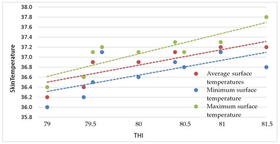 The ascending values of the temperature–humidity index and their corresponding measured values of the minimum (in blue), average (in red) and maximum (in gray) surface temperatures in the thigh area.