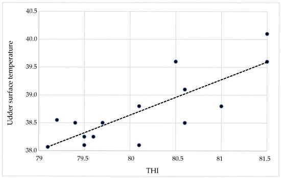 In Figure 3, some values of the temperature–humidity index correspond to more than one value of udder surface temperature, since for some cows the measured values of the temperature–humidity index coincided.