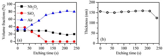 It can be observed that during the first 30 s of etching, the film composition remains unchanged. Beyond this point, the volume fraction of SiO2 begins to decrease, while the free volume (air) increases, indicating the onset of silica dissolution. After 120 s, SiO2 is completely removed from the film; however, the free volume continues to grow. A slight decrease in the niobia volume fraction suggests minor dissolution of Nb2O5 as well.