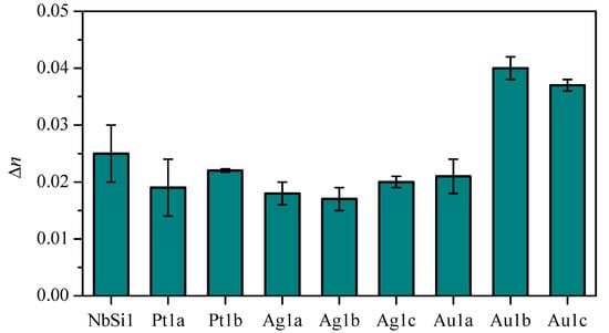Calculated values of refractive index change (Δn) due to exposure to acetone vapors of the denoted samples described in detail in Table 1. The error bars are calculated as a standard deviation from the average value of two samples.