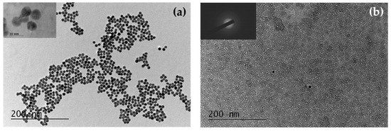 (a) Transmission electron microscopy (TEM), and high-resolution TEM pictures as an inset, of gold nanoparticles (AuNPs) with an average diameter of 10 nm; (b) TEM picture, and SAED (selected area electron diffraction) as an inset, of a thin Nb2O5 film doped with both SiO2 nanoparticles (Ludox) and 10 nm AuNPs (see Table 1, sample Au1b).