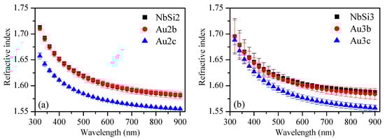 Dispersion curves of the refractive index for Nb2O5/Ludox thin films (NbSi2 and NbSi3 from Table 1) and Nb2O5/Ludox films doped with Au nanoparticles (AuNPs) of 10 nm (Au2b and Au3b) and 20 nm (Au2c and Au3c) at Ludox-to-AuNP ratios of 1:3 (a) and 1:4 (b). The error bars are calculated as a standard deviation from the average value of two samples.