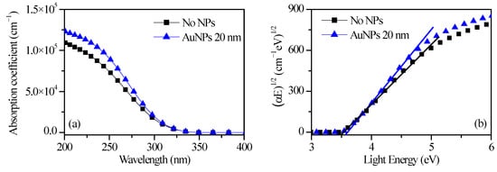 The next step of optical characterization concerns the determination of the absorption coefficient, optical band gap and Urbach energy. Figure 5 shows absorption coefficient as a function of wavelength for undoped Nb2O5/Ludox films and films doped with 20 nm AuNPs. It is seen from Figure 5a that doping leads to an overall enhancement in the optical absorption of the films, which is expected due to the strong light absorption properties of gold nanoparticles embedded within the Nb2O5 matrix.