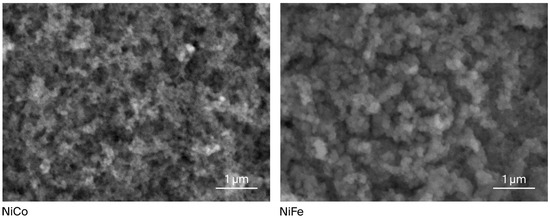 The SEM analysis (Figure 1) demonstrates that both NiCo-LDH and NiFe-LDH exhibits a homogeneous morphology with uniformly distributed particles in the nanoscale range, indicating that the resulting catalyst is nanostructured. The distribution of nanoparticles also shows the absence of agglomeration. In order to complement the morphological observations, the elemental composition of the samples was further examined using EDX analysis, and the corresponding spectra and quantitative results are provided in Table S1.