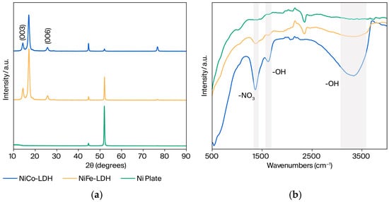 Moreover, NiFe-LDH is made in a similar way as NiCo-LDH, with the exception of the use of FeCl2.4H2O solution. For the Ni-Fe precursor, the solution was rested for 15 min to separate the undiluted precursor. The presence of layered double hydroxide was identified by X-ray powder diffraction (D8 Advance (Bruker, AXS GmbH, Karlsruhe, Germany), Bragg–Bentano Diffraction) at θ = 0.4 and FTIR (Thermo Scientific, Thermo Fisher Scientific, Waltham, MA, USA (Nicolet IS5), id7 atr transmission).
