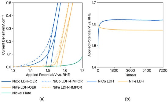 Furthermore, Figure 3b shows a curve acquired during the chronopotentiometry test for HMF oxidation. Before both samples reached stable conditions, NiCo-LDH’s applied potential increased with increasing reaction time. While at NiFe-LDH, the converse occurred. To achieve 0.25 mA/cm−2, the NiCo-LDH needs 1.65 V vs. RHE after 2 h of reaction, while NiFe-LDH is stable at 1.57 V vs. RHE. The increase in applied potential implies that the reaction becomes less kinetically favorable with time. This could be because cobalt exhibits stronger adsorptive characteristics [31], which may initially increase activity but eventually lead to surface passivation or the accumulation of chemical intermediates. As the surface gets partially obstructed, the applied potential needs to rise to sustain the current. Iron materials, on the other hand, possess fewer adsorption features that could potentially prevent surface passivation. Instead, the reaction intermediates are more easily desorbed, allowing the catalyst to perform more efficiently over time, resulting in a decrease in applied potential.