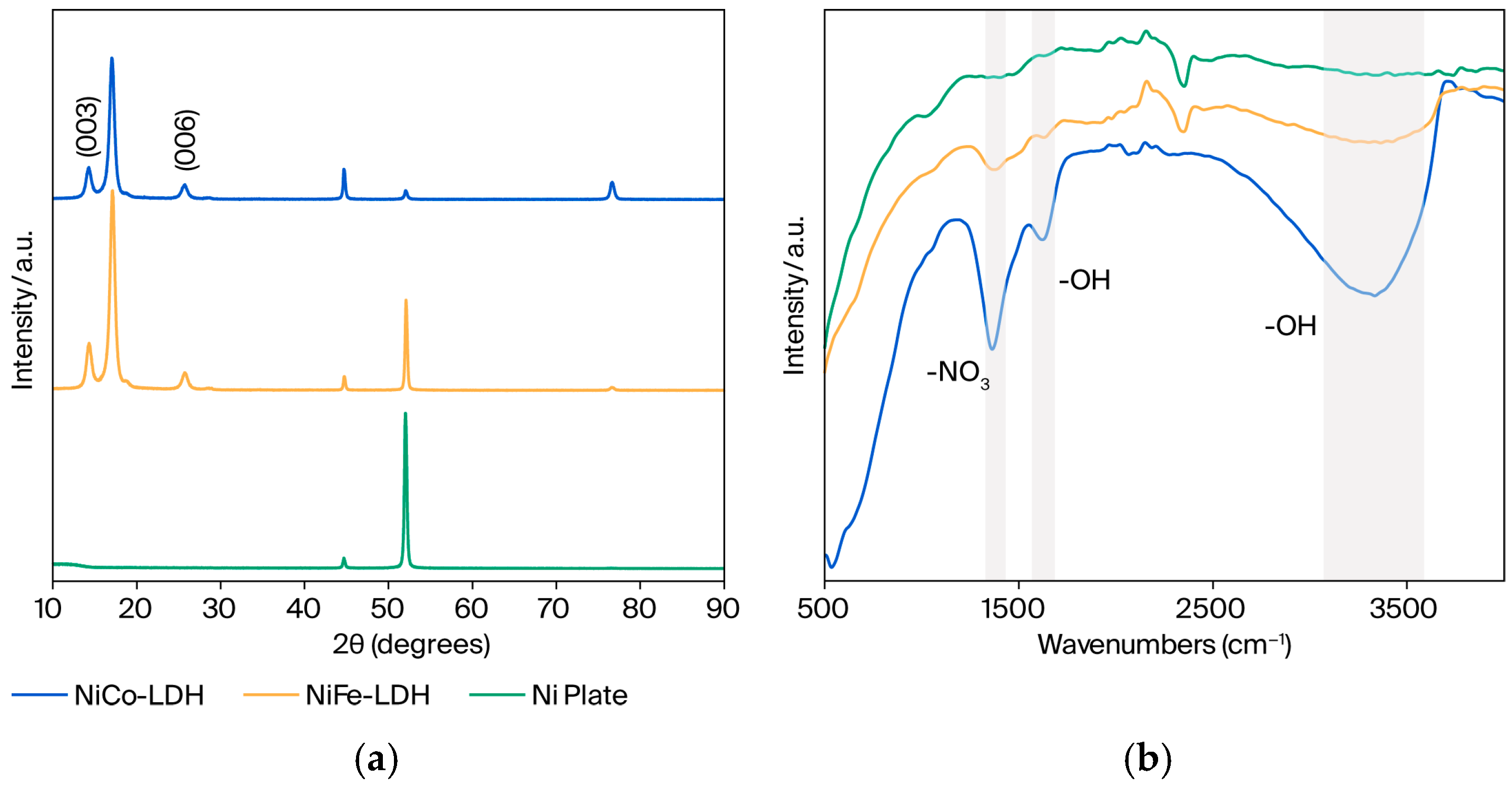 2.2. Synthesis and Characterization of NiCo-LDHs and NiFe-LDHs