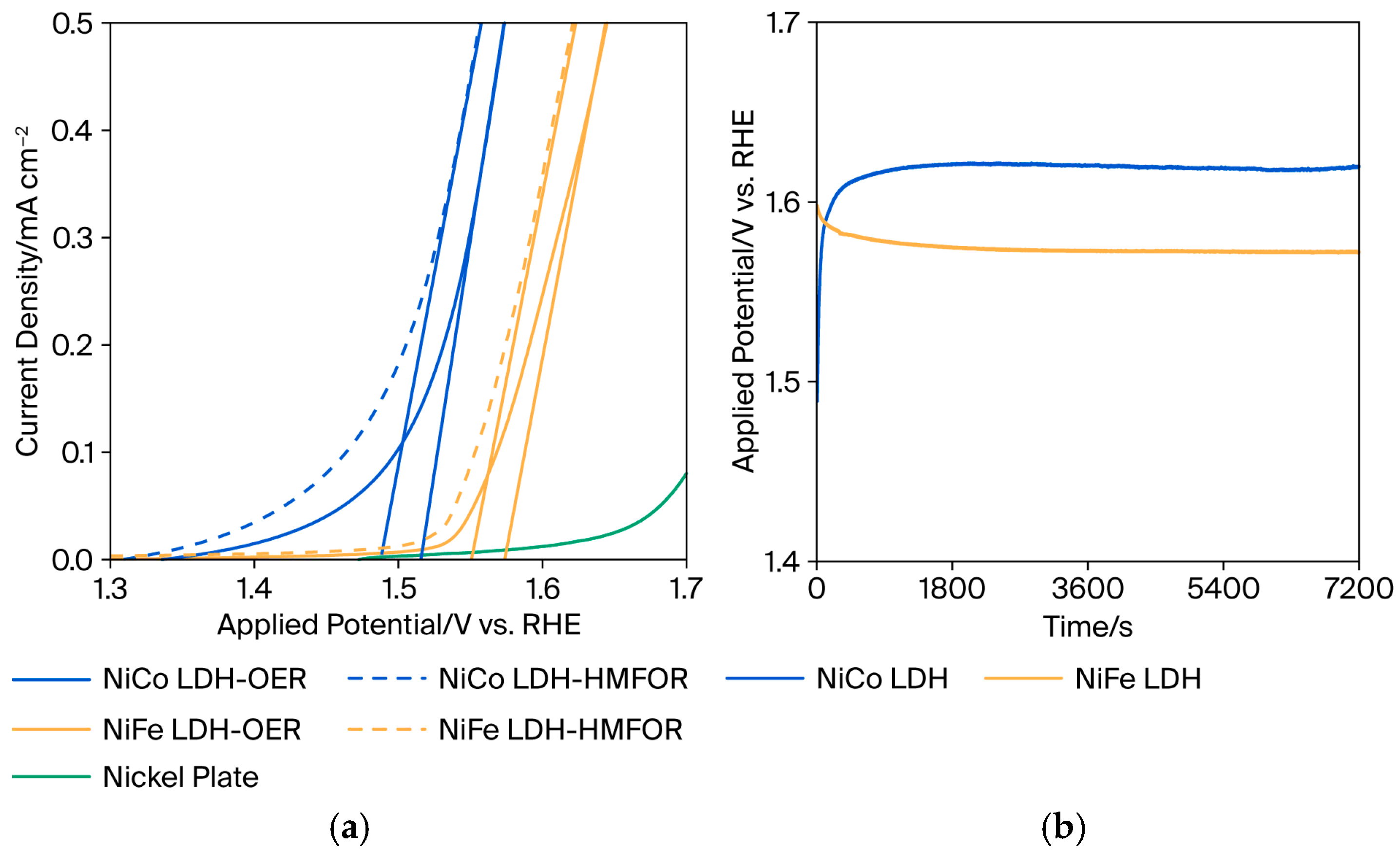 - Carvajal, D.; Arcas, R.; Gouda, L.; Fabregat-Santiago, F.; Mas-Marzá, E. Electrochemical valorization of HMF using Ni/Graphite electrodes. Mater. Chem. Phys. 2024, 311, 128510. [Google Scholar] [CrossRef]