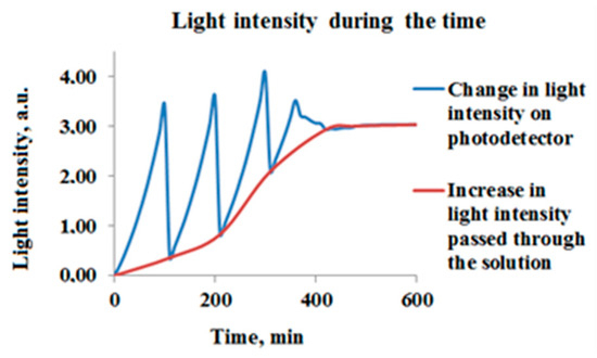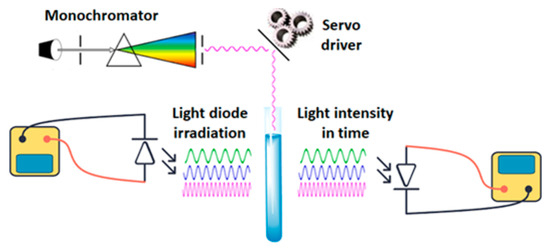 To determine the effective light wavelength range in photocatalytic activity with AgNPs, an experimental setup with software-controlled wavelength scanning was developed and implemented. The hardware was built around the Atmega2560 microcontroller, which ensures the coordination of all electronic setup components. These components include the light sources, the wavelength selection unit, the irradiation time control unit, and the registration unit (Figure 1).