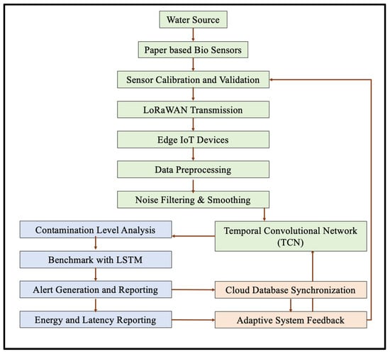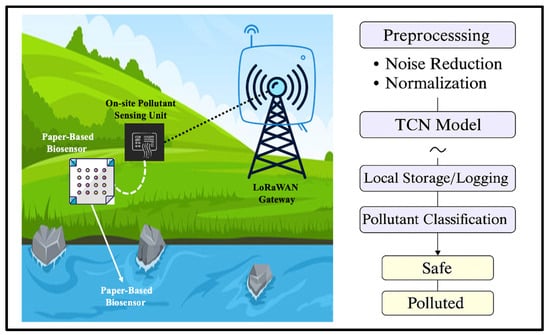 Freshwater pollution from industrial, agricultural, and urban sources continues to threaten human and environmental health [1,2]. Contaminants such as lead, arsenic, and nitrates cause serious health risks. Traditional manual sampling methods are slow and inefficient. Integrating edge IoT [3] with cyber–physical systems (CPSs) [4] and in situ paper-based biosensors, supported by LoRaWAN [5] and edge AI, enables real-time detection of contaminants. As shown in Figure 1, the proposed system incorporates sensing, edge processing, and feedback for efficient monitoring.