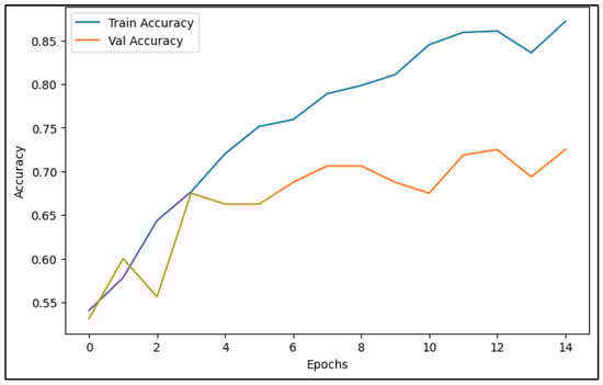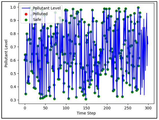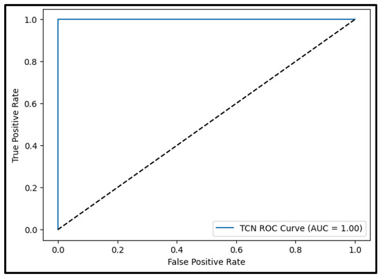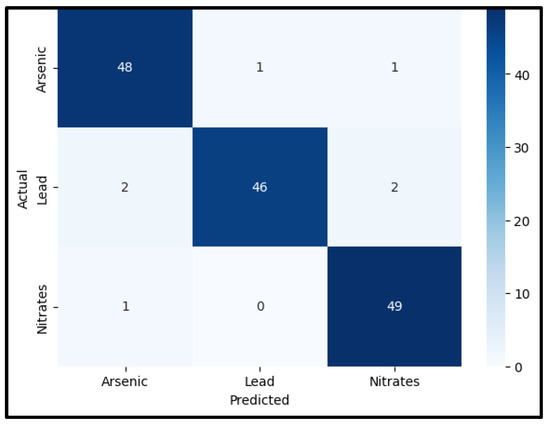 The observations from experimentation demonstrated that the edge IoT-enabled cyber–physical system is an outstanding system for real-time water contamination detection, using paper-based biosensors and a TCN model. A 98.7% detection accuracy of the proposed system was displayed, which compared favorably with the 92.4% obtained by the LSTM baseline model. Figure 3 illustrates the 15-epoch training history of a TCN model by presenting both the training and validation accuracy. Figure 4 presents a live-monitoring plot of pollutant readings that were taken at 300 consecutive time intervals. The sensitivity of the biosensor and LoRaWAN reliability are shown in combination in the dual-axis plot in Figure 5. The confusion matrix in Figure 6 visualizes the pollutant classification results for arsenic, lead, and nitrates. The strong diagonal dominance reflects the model’s robustness in accurately distinguishing between different pollutants. The ROC curve in Figure 7 shows the TCN model’s performance in classifying pollutants, delivering an AUC of 1.00, which means it can perfectly separate positive and negative cases. According to Figure 8, the TCN model achieved an AUC of 1.00 in pollutant classification, showing complete separation between polluted and clean samples.