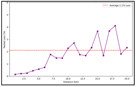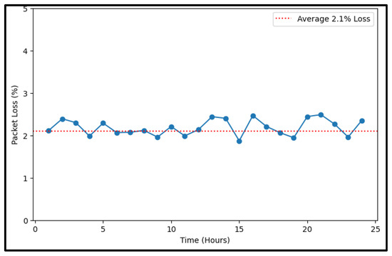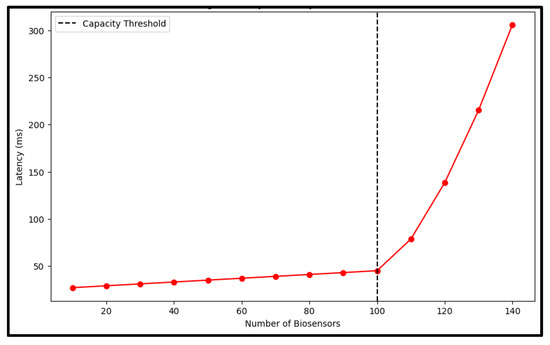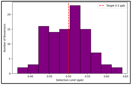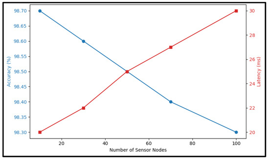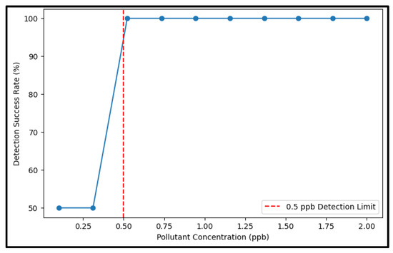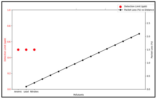 Figure 9 represents the system accuracy and latency shifts as the number of sensor devices rises from 10 to 100 nodes. The processing times for both the edge TCN and cloud LSTM models are compared. The distribution of biosensor sensitivities, according to their ppb detection limits, is shown in Figure 10. The detection success rate is displayed against the pollutant concentration in ppb in Figure 11. A plot of packet loss across 24 h can be seen in Figure 12, revealing values that mostly change within a band of 2%, with little variation. In Figure 13, the packet loss percentage is plotted against the transmission distance, considering weather conditions for distances of up to 20 km. The edge latency is depicted in Figure 14 as a function of the number of biosensors, with a certainly significant rise beyond 100 sensors, using a vertical dashed line to mark the system’s upper capacity limit.