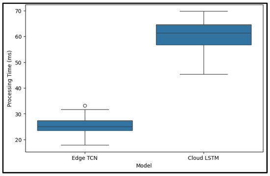 The entire system was installed on a Raspberry Pi 4 Model B, which has a 1.5 GHz quad-core CPU based on an ARM Cortex-A72, and 4 GB of RAM. In the cloud-side evaluation, we deployed an LSTM model on an AWS EC2 with 2 vCPUs and 8 GB of RAM. Data collection with a biosensor was carried out at 1 Hz, with the inference being performed either in real time or on an event basis. Latency was taken as the time between raw sensor information and the final contamination classification. The TCN system demonstrated an average latency of 26.3 ± 1.2 ms, whereas the cloud LSTM model produced a value of 42.4 ± 1.6 ms, leading to a reduction in latency of 38% that was proven to be correct.