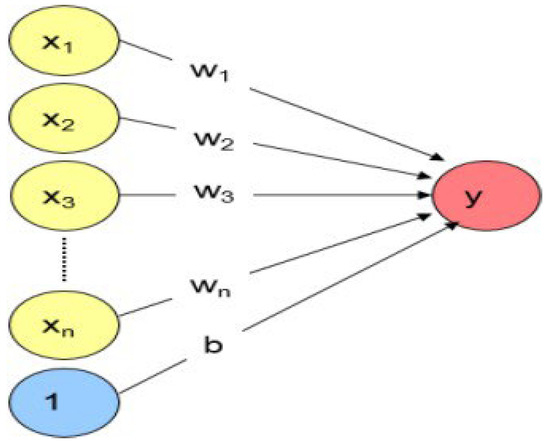 Artificial neural network (ANN) is an information processing method inspired by how the human brain works, where learning happens through examples [14]. ANN is used in tasks like pattern recognition and classification by adjusting its structure through a learning process. One simple type of ANN is perceptron, a single-layer network developed in 1962 by Rosenblatt, and later discussed by Minsky and Papert [15,16]. The structure of a simple perceptron is illustrated in Figure 1.